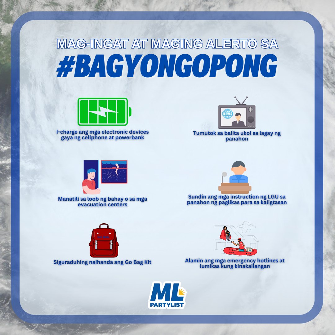 Makinig po tayo sa mga abiso ng ating LGU at mga otoridad, at maghanda sa posibleng malakas na ulan, hangin, at storm surge. Alamin po natin ang mga local emergency hotlines at lumikas agad kung kinakailangan.